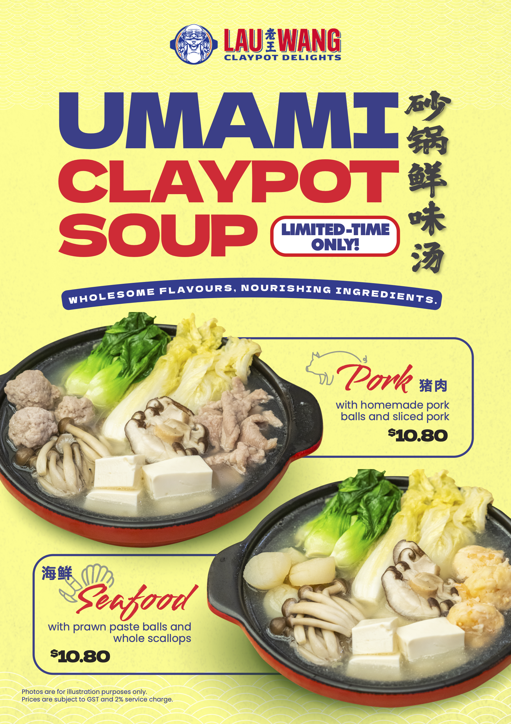 A rich and nutritious pork bone broth simmered to umami perfection, filled with a medley of vegetables, mushrooms, tofu and a choice of pork or seafood. A hearty claypot comfort, just like a bowl from home - available for a limited time only!