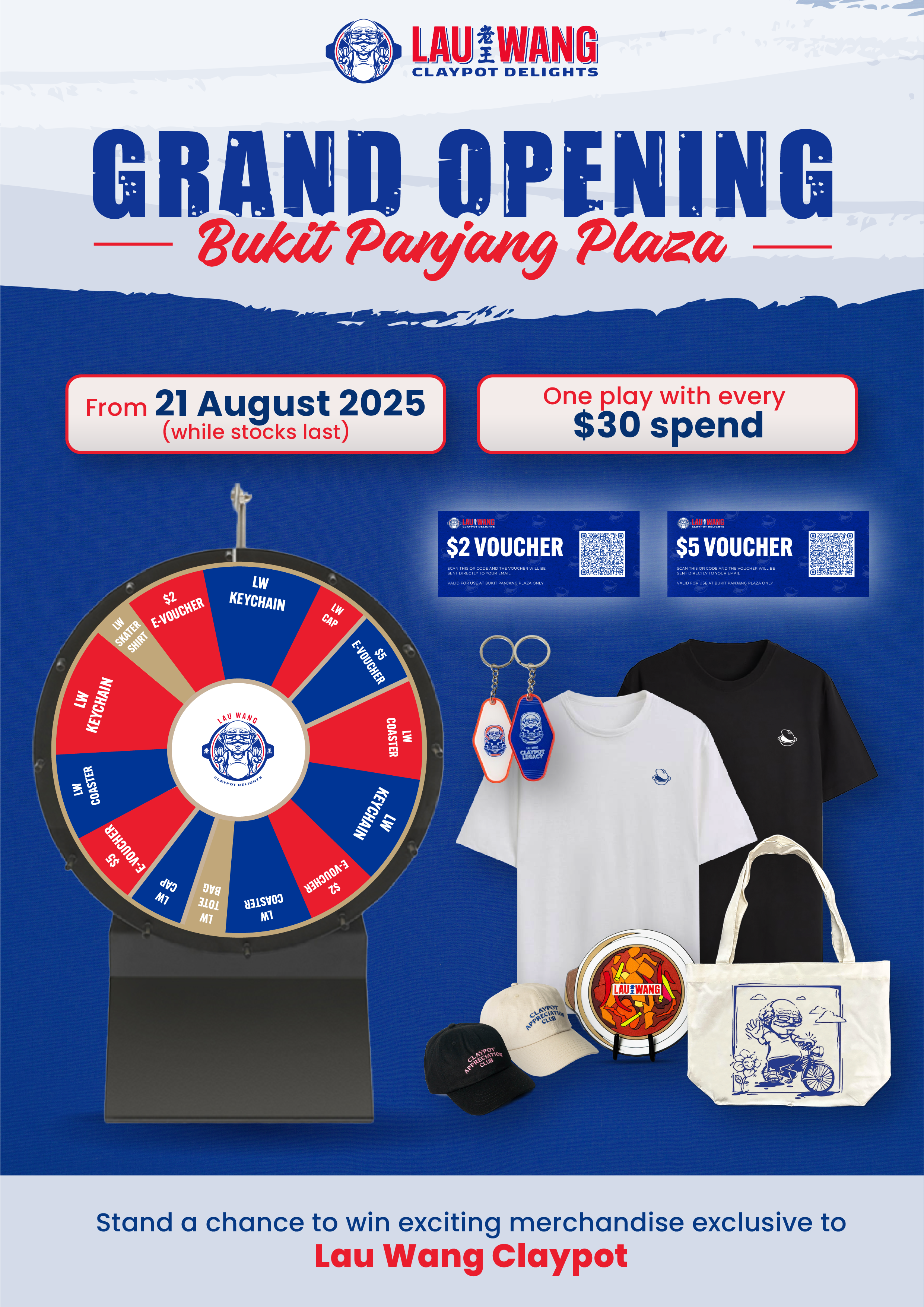 Join us in celebrating the opening of our Bukit Panjang Plaza outlet with a Sure-Win Spin the Wheel event! Spend $30 in a single receipt to earn a spin and stand a chance to win exclusive Lau Wang Claypot merchandise and exciting prizes.